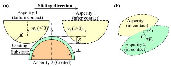 However, for now, only a few works have considered the sliding process between coated asperities and given the general expression of the contact force and effective dynamic friction coefficient related to the geometrical and material parameters (especially for coated asperities with power-law hardening elastic-plastic coatings). Thus, it might be essential to explore the effect of the geometrical and material parameters of the coating on the contact properties and then to get the general expression of the contact parameters in the coated asperity sliding process. Compared with the trial and error way, that would help choose the optimum coatings for the specific substrate materials for the sake of the low-friction design. Moreover, as the previous studies indicated, the hardening behavior of the elastic-plastic asperity materials also showed some influence on the contact parameters in the sliding process between homogeneous asperities [19]. For coated asperity sliding interactions, the effect of the hardening behavior has not been investigated yet. In this work, the sliding between a coated asperity and a homogenous asperity is studied, which exists in some applications (e.g., the shaft and the bearing bush in the marine engine under very bad lubrication conditions, as mentioned before), and the effect of the material and geometrical parameters of the coated asperity on the contact force and friction coefficient is explored. Based on this, the universal expressions of the normal and tangential contact forces and the dynamic friction coefficients is derived. It should be noted that only the friction behavior (e.g., friction coefficient) due to the plastic deformation of the coated asperity in the sliding process is focused on. As indicated by Bosman and Schipper [25], the frictional behavior (e.g., mild wear) is related closely to the plastic deformation of the uppermost material in the poor lubrication condition, which means the relation between the frictional behavior and the plastic deformation of the coated asperity is essential to be studied. Thus, in this work, the frictionless contact condition is adopted, and adhesion and failure are ignored to focus on this relation between the frictional behavior (e.g., contact force and friction coefficient) and the plastic deformation.