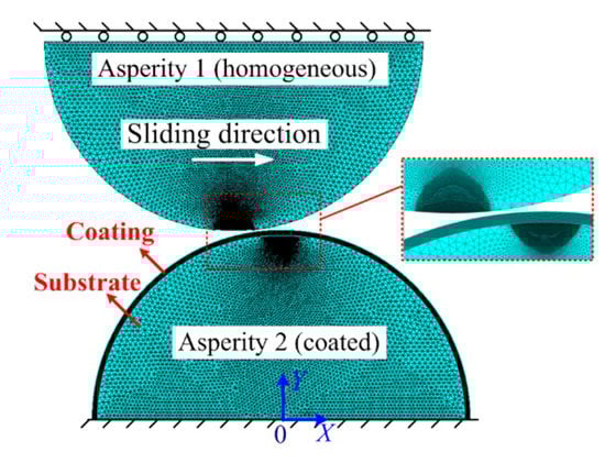 A two-dimensional (2D) plane strain model was proposed to study the sliding interaction with the commercial finite element (FE) software ANSYS 17.0, as shown in Figure 2. The eight-node PLANE 183 element was used to mesh the asperities, and the contact was accomplished by the contact element (CONTA172) and the target element (TAEGET169). The PLANE 183 element is a higher-order 2D element, which could be employed as a plane element or as an axisymmetric element, having plasticity, hyperelasticity, creep, stress stiffening, large deflection, and large strain capabilities. In addition, the CONTA172 element is applicable to 2D structural and coupled-field contact analyses, representing a deformable surface and the TARGE169 element could represent 2D target surfaces. These two kinds of elements are used for both pair-based contact and general contact. The total number of the elements was 77,002. The geometrical and material parameters were set as shown in Table 1. The von Mises yield criterion was adopted, and the frictionless condition was used in the sliding process. Two boundary conditions were set: (a) The base of Asperity 2 was fixed in all directions and (b) the base of Asperity 1 could only move along the Y axis. The displacement load was applied to the base of Asperity 1 along the Y axis in a quasi-static way in the sliding process. The contact force was focused and computed step by step in this work. The mesh convergence was checked by doubling the mesh density iteratively until the change of the results was less than 2% between two consecutive steps.