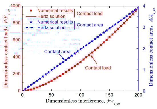 where Cν is the maximum dimensionless contact pressure at yielding inception related to the Poisson’s ratio, v, in slip condition satisfying Cν = 1.234 + 1.256v [28], and E’ is the equivalent elastic modulus of the contact pair. The two asperities were in vertical contact along the axes of symmetry (i.e., wh = 0 in Figure 1) with no sliding. The FE results were compared with the Hertz results as shown in Figure 3, and the difference of the contact force and area were both no more than 1.1%, which indicated the FE model was reliable.