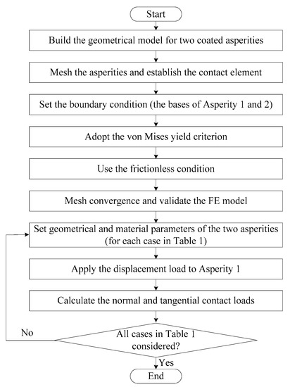 The sliding process between asperities has been considered by some researchers so far. Several methods were generally used to study this process, including the experimental approach and the theoretical approach. Some experimental works, which studied the sliding of the single asperity in the micro scale, were accomplished with apparatuses such as the atomic force microscope [6,7] or the scratch tester in micro or nano scale [8,9]. These studies have high requirements for experimental equipment, thus, many other researchers selected the theoretical way, such as the analytical method and the numerical method. Initially, the analytical method was adopted to study the elastic contact of the asperity suffering the normal and tangential loads as given by Cattaneo [10] and Mindlin [11]. Keer et al. [12] studied the tangential contact between two objects with different material and geometrical parameters. Hamilton [13] considered the sliding process and obtained the analytical equations of tensile stresses and yield parameters. However, the analytical method showed some limitations when some complex contact cases were studied with complex boundary conditions and material attributes. As computation power developed, the numerical method was more and more widely used by the researchers. The molecular dynamics method is an atomistic simulation to explain some phenomena in nature. Yang and Shi [14] explored the wear phenomenon in the frictional sliding process between an asperity and a rigid flat with the molecular dynamic simulation considering the generation of debris. Vadgama et al. [15] investigated the dry sliding between copper asperities and considered the effect of the interference, the sliding velocity, radius of the asperity, and the lattice orientation on the contact parameters with the molecular dynamic method. However, the foundation of the molecular model is still difficult, especially for complex physical materials and the computational process is very time consuming. By comparison, the finite element method was another widely used numerical approach. Faulkner and Arnell [16] gave a finite element model to study the sliding process between two homogeneous elastic-plastic asperities, and to explore the evolution rule of the contact force during the sliding process. A similar but more detailed model was developed by Vijaywargiya and Green [17] to consider the change of the contact stresses and the energy loss besides the contact forces in the sliding interaction. Jackson et al. [18], and later Zhao et al. [19], developed similar semi-analytical models considering different homogeneous asperity materials. In their works, sliding was regarded as lots of tangential loading–unloading processes between two asperities, and the universal equations of the contact parameters about the tangential loading and unloading obtained previously could be adopted. The semi-analytical results were compared and validated with the finite element results. The empirical equations of the contact force and the friction coefficient caused by the plastic deformation in the sliding process were obtained then. Mulvihill et al. [20] also studied the homogeneous asperity sliding process by considering more interference with adhesion and material failure, and the change of the friction coefficient was explored under different conditions.