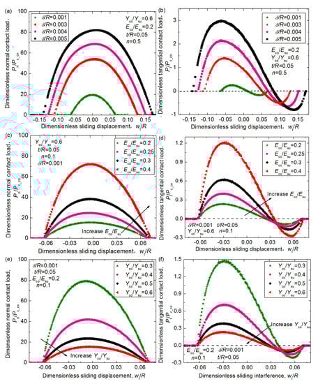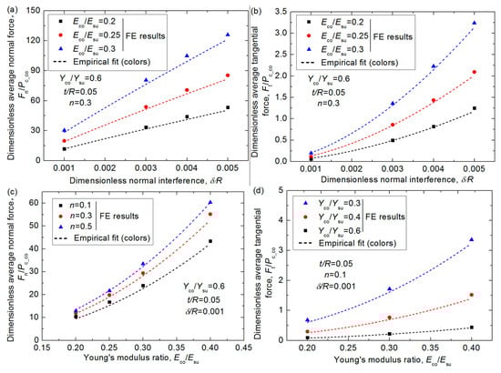 Considering the effect of the material parameters, Eco/Esu, Yco/Ysu, n, and the geometrical parameter, t/R, under different interferences, δ/R, the empirical expression of the average dimensionless normal force Fn/Pc_co and tangential force Ft/Pc_co could be derived as the following Equations (6) and (7):