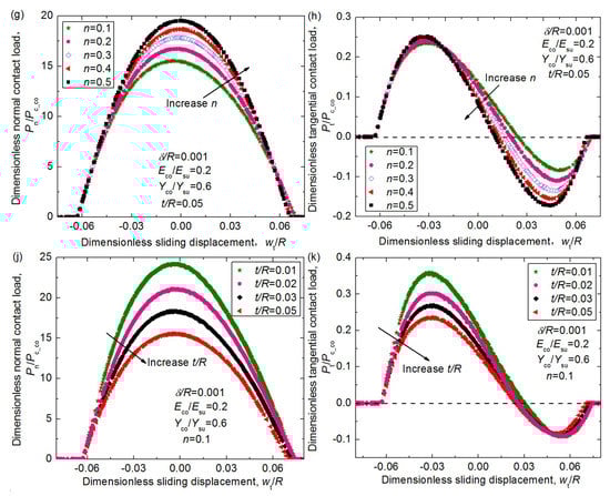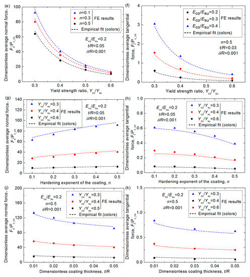 The dimensionless average normal and tangential force, Fn/Pc_co and Ft/Pc_co, under different normal interferences, δ/R, for different cases where Young’s modulus ratios, Eco/Esu, yield strength ratios, Yco/Ysu, hardening exponent, n, and thickness, t/R, of the coating changes in different specific range. (a) The effect of δ/R on Fn/Pc_co; (b) The effect of δ/R on Ft/Pc_co; (c) The effect of Eco/Esu on Fn/Pc_co; (d) The effect of Eco/Esu on Ft/Pc_co; (e) The effect of Yco/Ysu on Fn/Pc_co; (f) The effect of Yco/Ysu on Ft/Pc_co; (g) The effect of n on Fn/Pc_co; (h) The effect of n on Ft/Pc_co; (j) The effect of t/R on Fn/Pc_co; (k) The effect of t/R on Ft/Pc_co.