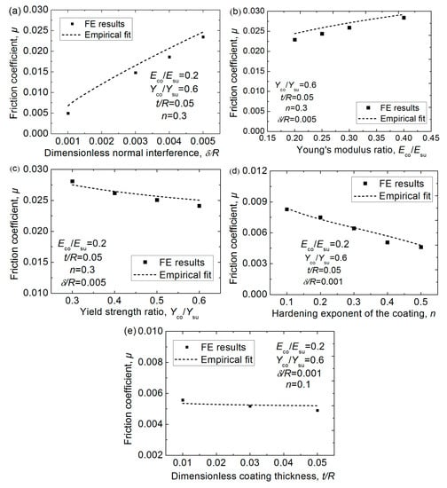The comparison between the FE results and the empirical fitting results given by Equation (8) is shown in Figure 7, which reveals the fit is good. It should be noted that the friction coefficient given by Equation (8) only comes from the energy loss due to the plastic deformation, which is only one source of the friction. It could be seen that the value of μ increases with the increasing interference, δ/R, and Young’s modulus ratio, Eco/Esu, while it decreases as the yield strength ratio, Yco/Ysu, the hardening exponent, n, and the thickness, t/R, of the coating increase.