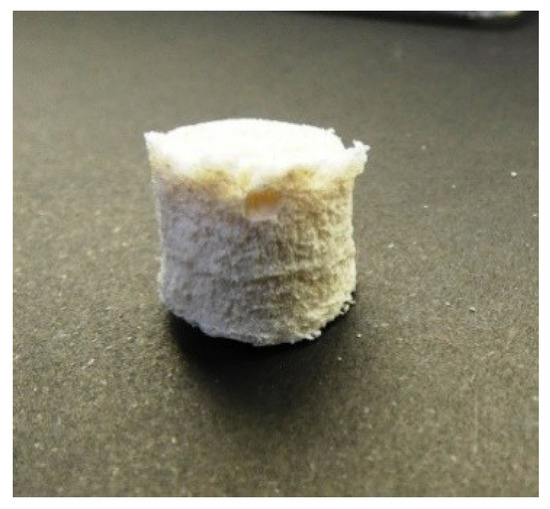 The scaffold was obtained by means of a cylindrical mold with physical characteristics corresponding to the mold used in the synthesis with a slightly yellowish coloration and a cylindrical area of 13.48 mm in diameter and 13.54 mm in height. The scaffolds were homogeneous in the macroscopic level, without cracks, presenting a spongy aspect with a certain degree of tension and compression. Figure 1 shows the image of the scaffold obtained.