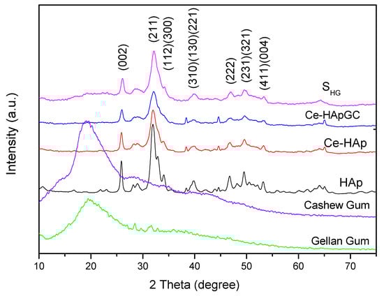 Figure 2 shows the X-Ray diffractograms for HAp, Ce-HAp, Ce-HApCG, the scaffold based on Ce-HApCG+GG (SHG), cashew gum, and gellan gum. The obtained diffractograms for the HAp and Ce-HAp were compared with the database available in the X’Pert HighScorePlus software and all peaks were indexed with JCPDS data (JCPDS Card number: 00-003-0747). Finally, it was also observed that Ce-HAp showed no changes in its lattice parameter in relation to pure hydroxyapatite The comparison between the XRD patterns show the presence of the plans (0 0 2), (2 1 1), (1 1 2), (3 0 0), (3 1 0), (1 3 0), (2 2 1), (2 2 2), (2 3 1), (3 2 1), (4 1 1) and (0 0 4) [9,40,41,42,43,44].