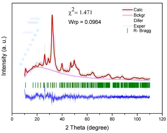 The Rietveld method was performed for the diffractogram of the SHG sample. The Rietveld refinement, performed in the EXPGUI/GSAS software, revealed the presence of a hexagonal crystal system with a P63/m space group and Laue group 6/m, with the following lattice parameters: A = b = 9.447481, and c = 6.897580 Å, and unit cell volume of 533.162328 Å3 [45]. Figure 3 shows the result of the Rietveld refinement. Rietveld refinement is qualified as satisfactory as to the empirically obtained value of χ2 and values equal 2.00 or less are satisfactory. The obtained χ2 value was relatively low: 1.471.