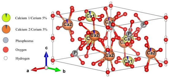 Figure 4 shows a schematic representative of the Ce-HAp unit cell synthesized in this research. The unit cell was simulated using the VESTA (Visualization for Electronic and Structural Analysis) software [46] and also using the lattice parameter that were obtained by Rietveld method. The simulation performed in the software did not allow the inclusion of parts of the substituent ion, so the doping ion, i.e., the cerium, is represented by dark blue parts present in the Ca1 and Ca2 atoms.
