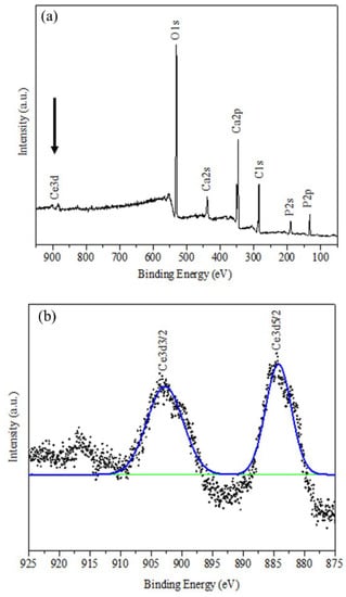 The presence of cerium in Ce-HAp was confirmed by XPS. Thus, the elements that constitute Ce-HAp were detected: Peaks at 440 eV (Ca2s), 348 eV (Ca2p), 188 eV (P2s), 132 eV (P2p), and 530 eV (O1s). It was also possible to detect discrete emission lines (875–925 eV) related to the electron doublets ejected from the Ce 3d orbital (Figure 5b). The electronic state assigned to position v and u revealed excitations in binding energy (B.E) corresponding to the 3d5/2 and 3d3/2 pairs of spin-orbit doublets. This type of spin-orbit coupling corroborates with existence of the cerium in the structure of Ce-HAp [47].