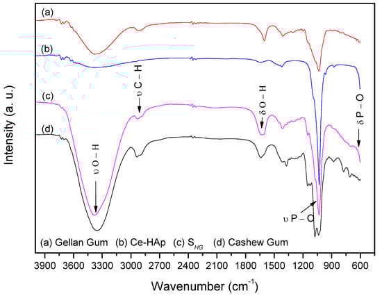 FTIR spectra of scaffold and precursor materials: (a) Gellan gum, (b) Ce-Hap, (c) SHG, and (d) cashew gum.