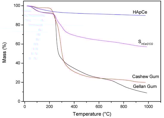 For the TG curve of the Ce-doped hydroxyapatite, only one thermal event related to mass loss was observed at a temperature of approximately 100 °C. This loss of mass can be attributed to the exit of water adsorbed on the surface of Ce-HAp. The value of mass loss in this event was 2.7% [54,55]. The TG analysis of the GG showed two thermal events with the first event occurring in the range of 27 to 124 °C, corresponding to 5.87% of the mass loss attributed to water [56,57]. The second thermal event occurs between 195 to 353 °C, referring to the degradation of the polymer, with the mass variation to 54.54% [56,57]. The TG curve of the SHG showed that the scaffold presented the same thermal events of the precursors materials. When comparing the value, in percentage of mass of the Ce-HAp, an increase in the value of the mass was noticed. The addition is attributed to the sum of the water mass adsorbed on the hydroxyapatite to the mass of the two gums present in the scaffold structure. The second thermal event appeared in the range of 200 to 572 °C with a mass loss of 27.44%. This loss of mass is attributed to the decomposition of the polysaccharide structure of CG and GG present in scaffold [53,56,57].