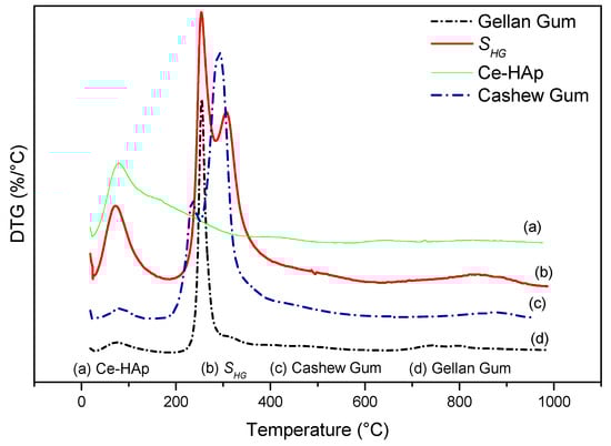 DTG of (a) Ce-HAp, (b) SHG, (c) cashew gum, and (d) gellan gum.
