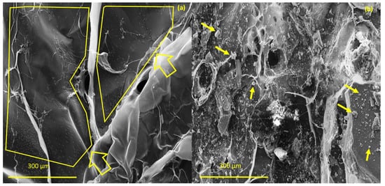 The investigation morphology and porosity of the scaffolds was performed by FESEM. Figure 9 shows a smooth and translucent surface with aggregates of Ce-HAp particles distributed along the material as well as in the inner layers of the scaffold. The smooth layer is attributed to the polymer network of GG, this assertion is proven when comparing with the micrograph of GG (Figure 9a). Figure 9b shows white-colored agromellated microparticles, attributed to hydroxyapatite that is dispersed over the polymer network. It is also possible to notice a distribution of Ce-HApCG microparticles.