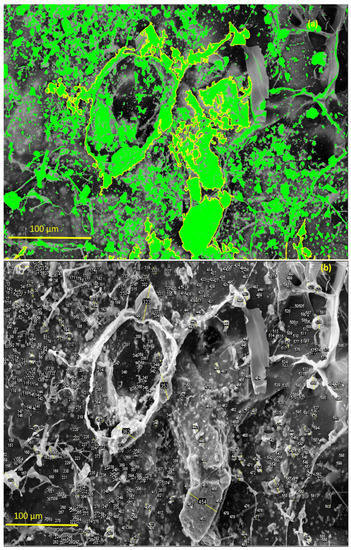 With the aid of ImageJ software and tool measures [59], it was possible to observe the distribution of the Ce-HApCG granules along the polymer network. The green points highlighted in Figure 10a refer to this distribution. The highlight shown by the staining allowed to observe the different size that the Ce-HAp is dispensed on the surface of the composite. It was observed that the great majority of the particles distributed were in the form of small medium-sized granules (~2 μm). However, it is possible to observe the existence of some larger granules. Figure 10b shows the labeling of the Ce-HApCG granules which was performed by ImageJ software.