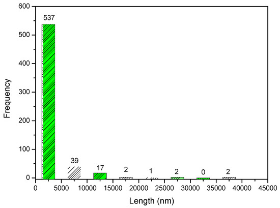Through 600 points selected in the micrograph, it was possible to prepare a histogram with the frequency of the size of the granules in the composite. The histogram is shown in Figure 11. From the histogram data, it can be observed that 89.5% of the measured granules have an average length of about 2.5 μm. However, when looking at Figure 12, the presence of granules at the nanoscale is noted.