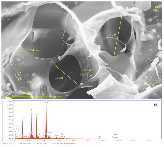 The energy dispersive spectroscopy (EDS) spectrum of scaffold, shown in Figure 12b, revealed the qualitative composition of the material. It was possible to identify Ca, P, O atoms from the hydroxyapatite composition. It was also possible to identify the presence of cerium that is incorporated in the HAp. Finally, the identified Na, Cl, Mg, and K atoms are derived from the GG composition. The gold identified in the EDS comes from the sample preparation process by FESEM.