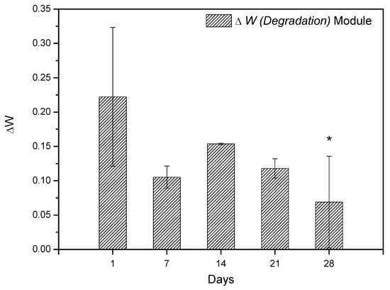 In vitro degradation studies were performed by immersing the scaffolds in simulated body fluid (PBS). The scaffolds were weighed on an analytical balance, and then samples were immersed in PBS at 37 °C in a drying oven. The period of the degradation studies occurred in the following intervals: 1, 7, 14, 21, and 28 days, replacing PBS each 7 days. The calculation of the degradation studies was performed by Equation (1) [76]: