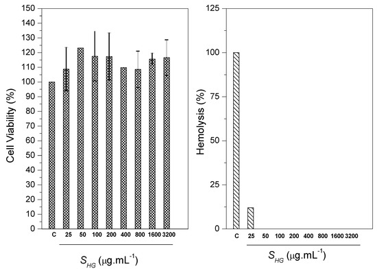 For its evaluation, hemolytic activity was performed on erythrocytes of blood of goats. The erythrocytes were collected with anticoagulant (EDTA). The study was approved by the Ethics Committee on Animal Use (CEUA/UFPI), n° 117/15. After collection, the erythrocytes were diluted in 80 μL of PBS and the blood concentration was adjusted (5% red blood cells). Next, SHG scaffold was diluted with the addition of PBS (20 μL). Immediately after, the erythrocytes were incubated (1 h at 37 °C) and the reaction was stopped to re-add of PBS (200 μL). The suspension was centrifuged (1000 G, 10 min) at room temperature. After centrifugation, the supernatant was measured at 550 nm to quantify the hemolytic activity. The absence (negative control) and 100% hemolysis (positive control) were determined, replacing the sample solution tested with equal volume of PBS and ultrapure water, respectively. The procedure was performed in triplicate and the results were expressed as percentage and hemolytic concentration (CH50) for 50% of erythrocytes considering the positive control as 100% hemolysis [78].