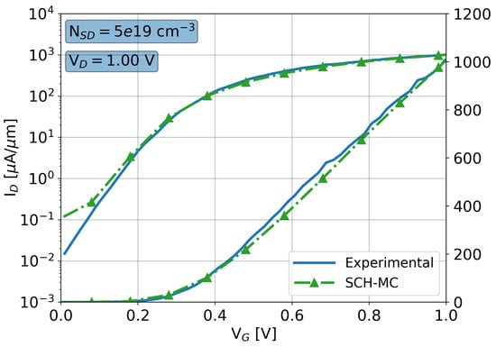 I-V characteristics for a 22 nm gate length GAA-NW FET (gate-all-around nanowire field effect transistor) at a drain bias of V comparing experimental results from [14] against Schrödinger equation corrected Monte Carlo (SCH-MC) simulations from VENDES. The maximum source/drain Gaussian doping has been set to cm.