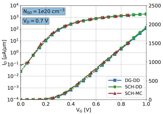 I-V characteristics for a 10 nm gate length GAA-NW FET at a drain bias of V comparing simulations results from density-gradient quantum-corrected drift-diffusion simulations (DG-DD), Schrödinger quantum-corrected drift-diffusion simulations (SCH-DD) and SCH-MC. The maximum source/drain Gaussian doping has been set to cm.