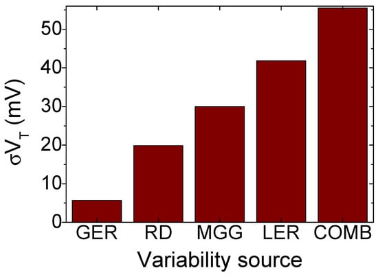 For each variability source, ensembles of 300 device configurations were created and simulated at a high drain bias of V. Figure 5 shows the impact of the aforementioned sources on the 10 nm GAA-NW FET threshold voltage variability. The statistical sum of the four sources of variability (COMB) has also been included as comparison. Results show that GAA-NW FETs are heavily influenced by the LER variability in the sub-threshold region, with V values and times larger than those of the MGG and the RD, respectively. The GER is the least influential source of variability having its V a lower than that of the LER. Note that the combination of the four sources of variability leads to a V standard deviation of mV, a value larger than the one observed (V = 30 mV) in a similar gate length Si FinFET [7] of nm.