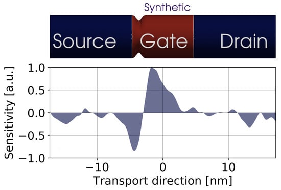 The FSM can be also used as an assistance in the design of variability-resistant device architectures since it pinpoints to parts of the device the manufacturers should concentrate their efforts on. Figure 6 shows an example of the on-current FSM obtained when a single LER deformation is applied to a specific location of the device, narrowing its width. Using this synthetic deformation, it is possible to sweep all the locations along the device, measuring the changes in the FoM that enable us to the spatial sensitivity to LER variations. Note that, in Figure 6 (bottom), a negative (positive) sensitivity indicates an increase (decrease) in the on-current. The effect of the synthetic deformation on the on-current depends on its position along the transistor. Any change in the NW width happening near the source-gate junction will heavily impact the device on-current whereas if the deformation occurs near the source or drain ends, its impact on the on-current will be minimal.