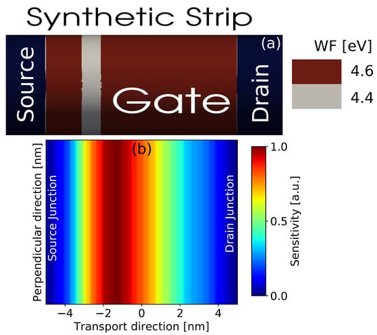Similarly, the FSM can be applied to other sources of variability, like the MGG, taking into account that the generated fluctuation map will now be two-dimensional (2D), in order to characterise the whole device gate. Figure 7a shows a scheme of the device that has a fixed WF value of eV in all the gate except from a narrow strip in which the WF is eV. This narrow strip is swept along the gate and for each position, the device configuration was simulated at a high drain bias of V and the corresponding on-current was extracted. The resulting 2D on-current FSM due to the MGG is shown in Figure 7b. This map allows us to establish that any variation in the WF located between X = nm (middle of the gate) and X = nm, will have the largest impact on the device performance. However, the GAA-NW FET will be practically insensitive to WF variations happening in the proximity of the source (X = nm) or the drain (X = nm) junctions.