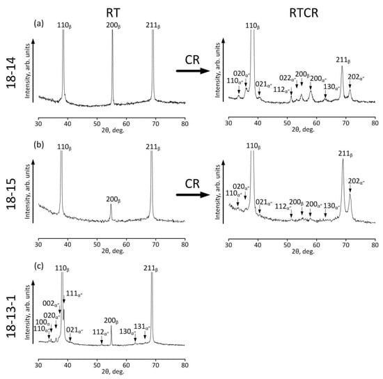 Figure 1 shows the XRD profiles of the 18-14, 18-15, and 18-13-1 alloys subjected to TMT. Initially, the XRD peaks obtained at room temperature (RT) of the 18-14 and 18-15 alloys correspond to the β-phase only, which is identified by its characteristic (110), (200), and (211) lines. Therefore, the samples of these compositions were additionally cold-rolled to 5–7% of residual strain in order to induce a certain quantity of stress-induced α”-martensite, as was done in []. This is necessary for calculating the crystallographic recovery strain limit of the alloys studied.