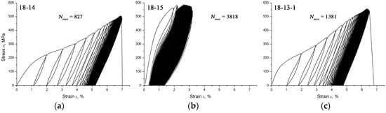 Typical sets of loading‒unloading diagrams obtained during multi-cycle testing of (a) 18-14, (b) 18-15, and (c) 18-13-1 alloys subjected to TMT.