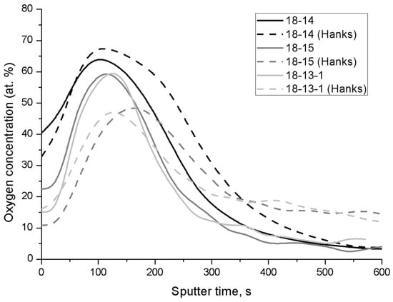 In order to estimate the oxide layer thickness, the oxygen distribution profiles were obtained for the surface of each sample (Figure 3). The required value can be considered as the inflection point of each curve; it is determined by double differentiation of the “oxygen concentration vs. sputter time” dependence, assuming a sputtering rate of 8.3·10–2 nm/s. The results are listed in Table 5.