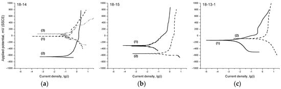Polarization diagrams of (a) 18-14, (b) 18-15, and (c) 18-13-1 alloys (1) before and (2) after TMT, and (3) the 18-14-based foam material in Hanks’ solution at 310 K.