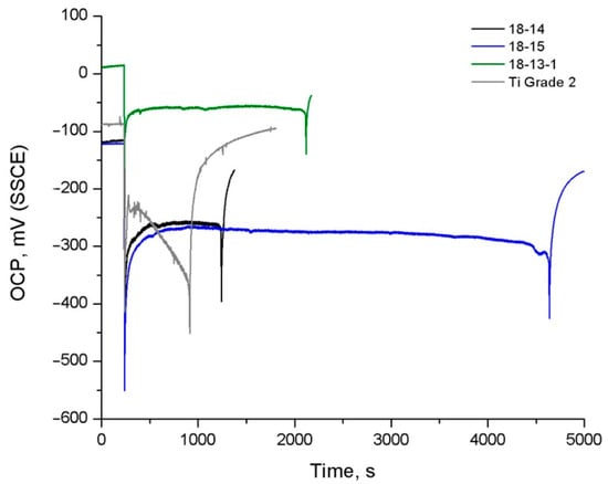 It must be noted that the OCP behavior during the cycling of superelastic Ti‒Zr-based alloys and non-superelastic Ti Grade 2 is different. For superelastic alloys, during cycling, an increase in OCP is observed, which is related to the plastifying impact of the chemomechanical effect, which takes place at the sample/electrolyte interface [,,], with the subsequent establishment of a constant OCP value during cycling, Ec. As follows from Table 7, the highest Ec values are observed for the 18-13-1 alloy, which can be explained by the higher permeability of thinner oxide films, which does not facilitate the accumulation of dislocations in the near-surface area.