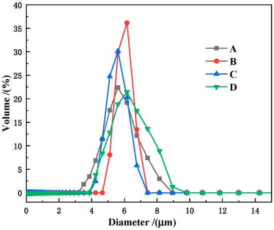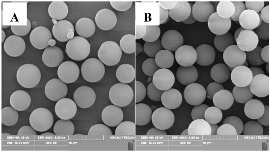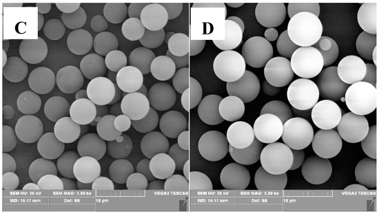 Polymer microspheres have carboxyl functional groups, thus they induce the growth of Fe3O4 on the compound surface. The content of the carboxyl functional groups is controlled by the proportion of MAA monomer in the copolymerization process. Therefore, the influence of St: MAA ratio on the morphology, the particle size distribution and the carboxyl content of P(MAA/St) microspheres were studied. P(MAA/St) microspheres with different St: MAA ratios were prepared. According to the SEM images (Figure 1), all the four kinds of composites had a smooth surface and uniform particle sizes. The particle sizes of the microspheres were about 4–7 μm. When the amount of MAA is too large or too small, small P(MAA/St) microspheres appear in the product. This is because the MAA polymerization activity is higher than St. When a small amount of MAA is used in the system, the amount of copolymer of initial PMAA (polymethylacrylic acid) as the main component is less. This copolymer plays an important role in stabilizing primary nucleating particles. Meanwhile, the content of PMAA in the copolymer affects the solubility of initial P(MAA/St). Premature and homogeneous nucleation led to a wide particle size distribution. Therefore, we can see the small P(MAA/St) microspheres in Figure 1A. An overload of MAA content in the system severely caused a large difference in monomer components in the system before and after the polymerization.