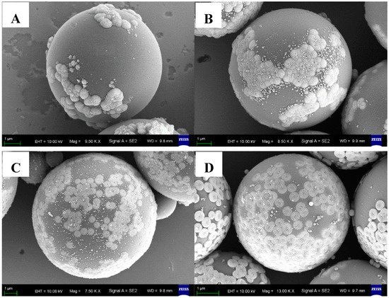SEM images of the C/Fe3O4 composite microspheres: MC-1 (A); MC-2 (B); MC-3 (C); MC-4 (D).