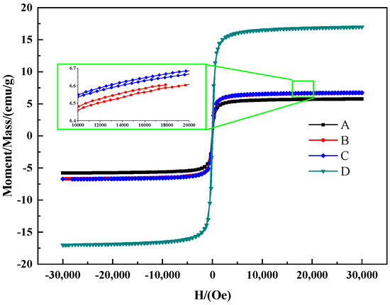 Curves of P(MAA/St)/Fe3O4 prepared by polymerized microspheres with different carboxyl content on the surface: MP-1 (A); MP-2 (B); MP-3 (C); MP-4 (D).