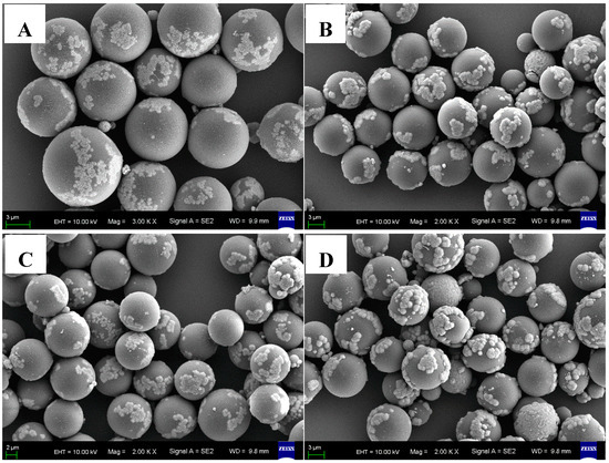 The MP-1, MP-2, MP-3 and MP-4 were carbonized in a vacuum atmosphere. The obtained samples were named MC-1, MC-2, MC-3 and MC-4, respectively. SEM images are shown in Figure 5, and it can be seen that Fe3O4 particles on the surface of C@Fe3O4 magnetic composite microspheres are well maintained after the carbonization process. However, there are some changes in the morphology of the Fe3O4 nanoparticles and aggregates on the surface of the microspheres. For MP-3 and MP-4, Fe3O4 nanoparticles are attached to the surface of the polymer microspheres in a toroidal or flat sheet morphology (Figure 3). The morphology of these aggregates changed significantly after carbonization. The Fe3O4 nanoparticle clusters on the surface of MC-3 and MC-4 microspheres have a higher degree of aggregation, as shown in Figure 5C,D. Simultaneously, the amount of Fe3O4 on the surface of the microspheres is gradually increased from MC-1 to MC-4. The C@Fe3O4 magnetic composite microspheres basically maintain the morphology of P(MAA/St)/Fe3O4 microspheres. The particle size of the microspheres concentrated in 4–6 μm. The reason for the particle size reduction is volume shrinkage due to the loss of organic components during carbonization.