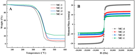 The different C/Fe3O4 composite microspheres were characterized by TGA and VSM as shown in Figure 7. It can be seen from the TGA curve that the initial decomposition temperature of C/Fe3O4 is above 300 °C. According to the TGA results and calculations, the iron oxide contents of samples from MC-1 to MC-4 were calculated to be 4.85%, 7.70%, 12.17% and 21.56%, respectively. According to the VSM curve, carbonization rarely influenced the superparamagnetic of the microsphere material. The maximum saturation magnetization values of MC-1, MC-2, MC-3 and MC-4 were 9.06, 10.97, 13.34 and 20.46 emu/g.