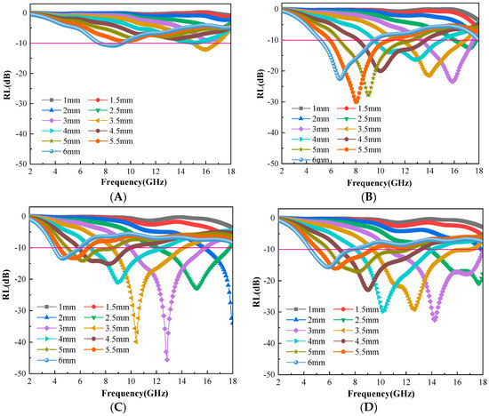 The electromagnetic wave absorption efficiency of the absorbing materials was expressed by the reflection loss (RL). According to the transmission line theory, the calculation formula was as follows [28]: