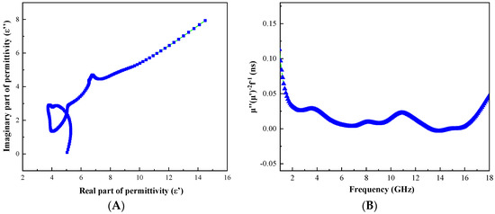 where εs is the static dielectric constant, ε∞ is the limit of the relative dielectric constant at high frequencies, and ε0 is a dielectric constant in vacuum. From this expression, it is known that the curve about ε′ and ε″ is a semicircle, which is called the Cole-Cole semicircle. Each semicircle corresponded to a Debye relaxation process [3]. A plot of ε″ versus ε′ is presented in Figure 11A. A clear Cole-Cole semicircle can be seen from the figure. This confirmed the existence of the Debye relaxation process. The eddy current loss effect was judged by the equation . If the eddy current loss existed in the electromagnetic wave absorption process, C0 was always constant as the frequency changed [31,32]. The relationship between C0 and the frequency of C@Fe3O4 is shown in Figure 10B. The curve was approximately straight in the range of 6–9 GHz and 14–16 GHz. This further indicated the presence of eddy current losses in this frequency range. The natural resonance effect was described by the following formula [11]: