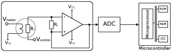 Schematic of an SMO sensor with interface blocks. The sensor includes a heating element and sensing film, a voltage follower, and an analog-to-digital converter (ADC). To process the sensor data, it is connected to a microcontroller, which contains a read-only-memory (ROM), random access memory(RAM), and input/output (I/O) interfaces.