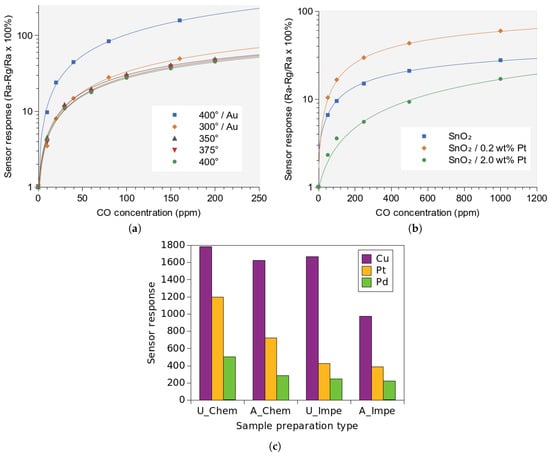 Tangirala et al. [] recently studied the influence of different dopants on the sensitivity of an SnO film with regard to its response towards CO, shown in Figure 3c. The influence of Cu, Pt, and Pd is analyzed with the additives being incorporated using chemical (Chem) and impregnation (Impe) methods with urea (U) or ammonia (A) as precipitating agents. The study shows that the optimal sensitivity is reached, when chemical methods with urea as precipitant are used for dopant incorporation, while Cu was found to provide the highest sensitivity. The urea precipitator forms a uniform and homogeneous particle distribution during synthesis, which is why this method leads to an increased sensitivity. Furthermore, Cu was shown as the additive which provides the most sensitive response because the reaction of the copper atom with adsorbed oxygen to form CuO was found to be optimal at the sensor operating temperature.