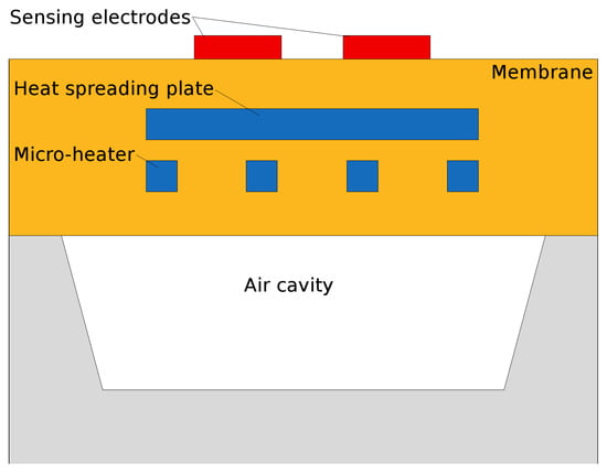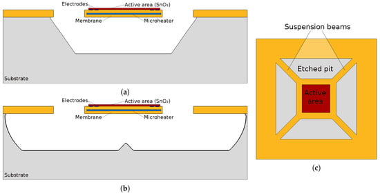 The requirement of a heater element is the primary source of the complexity in the design and fabrication of SMO sensors. The inclusion of a heater means that a suspended membrane must be produced, which houses a microheater and hosts the active sensor region. While several methods exist to create this membrane using MEMS techniques, performing this feat using CMOS techniques provides several advantages, mentioned in the previous section. Several means of fabrication can be used to produce the desired membrane. It can be formed by first depositing all the necessary layers, then etching from the back of the wafer, until the membrane is reached and thereby exposed. This back-side etching can be formed using deep reactive ion etching (DRIE). Alternatively, the membrane can be formed by etching from the top, through prepared openings in the membrane, which form suspended beams and the active region. This fabrication step can be formed using wet chemical or plasma etching. When etching proceeds from the wafer backside, a full or closed membrane is generated, resulting in thicker membranes (in the range of 1 m to 2 m) and a higher power dissipation compared to the suspended membrane alternatives. In addition, perfect alignment when etching from the back is difficult to achieve and can add to the cost of fabrication, since this method is not fully CMOS technology compatible [,]. When etching through pre-generated holes from the top of the wafer, a suspended membrane is achieved []. One advantage of this method is that the heat from the microheater can only escape through these thin suspension beams, resulting in a better power performance of the overall sensor.