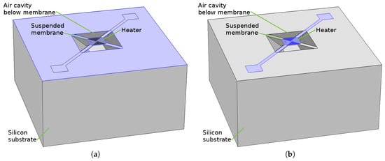 Simplified geometry of a device used in the electro-thermo-mechanical FEM model. In (a) the membrane materials are highlighted, which can include silicon nitride and silicon dioxide. In (b) the microheater is highlighted. The sensing layer and electrodes are not shown.