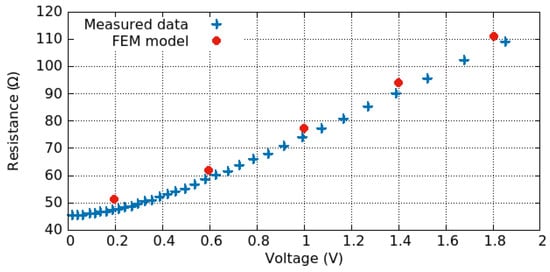 where A is the cross-sectional area of the film. The relationship between the resistance and the applied voltage is plotted in Figure 7, where the described model reproduces the measured data very well [].