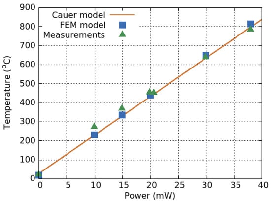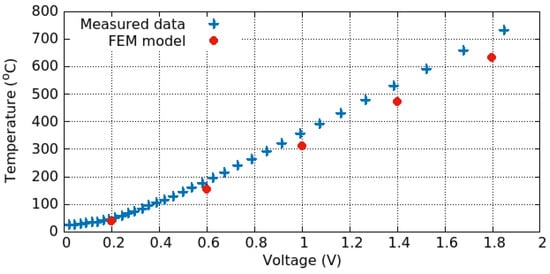 where h is the mean heat transfer coefficient and is the exposed area from which the heat flows. The relationship between the temperature obtained on the hotplate and the applied voltage is plotted in Figure 8 and the relationship between the dissipated power and the applied potential is shown in Figure 9. The model reproduces the measured results quite well. The difference evidenced in the temperature plot could be attributed to the fact that the temperature cannot be measured or read directly. Rather, it is calculated based on several measurements of the resistance at different temperatures and empirical parameters determined through additional experiments using the formula []