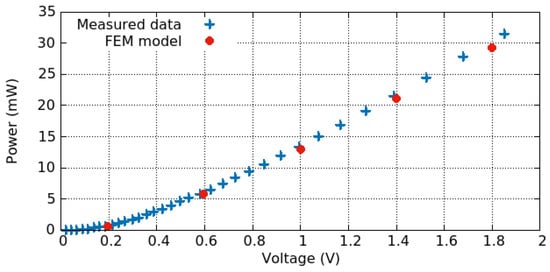 FEM simulation and measured power dissipated by the sensor for different applied biases.