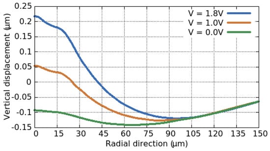 Simulation results of the out-of-plane displacement of the top surface of the membrane along its radius. The hotplate is biased and the deformation is caused by the intrinsic and the thermal stress caused by the temperature increase due to the Joule effect.
