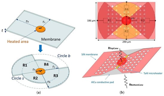 The choice of microheater and membrane design are critical to achieve a uniform temperature distribution across the active region of the sensor. The temperature determines the quality of the sensing mechanism and is therefore one of the most important aspects, which should be carefully controlled during operation. Materials with high thermal conductivity are necessary to achieve the desired temperature distribution. However, using high thermally conducting films can increase thermal leakage to the silicon substrate, resulting in a high power loss. Recently, many researchers have increased their efforts to find the right material for the microheater and the right geometry to improve the temperature uniformity. One solution, proposed by Lahlalia et al. in [], is to use a dual-hotplate design which introduces a single circular microheater along with two passive micro-hotplates. The operating principle of this design is enabled by the high thermal conductivity of the microheater layer compared to the membrane materials. Often, in order to understand the relationship between the applied bias, the resulting heater temperature and consumed power, and to ultimately improve the sensor, many simulations must be performed, until an optimized design is found. For this purpose, the FEM is not always desired, due to the stringent numerical requirements for complex geometrical designs and the need for transient simulations, which can increase the simulation time to an unreasonable scale. An alternate solution is using an equivalent electric circuit to discretize the microheater and the membrane in a Cauer model.