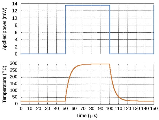 When assigning material properties for the simulation, it is essential that these are calibrated to the fabrication process. Published values for many parameters can vary significantly, since they depend considerably on the fabrication process []. An example is the thermal conductivity which is strongly influenced by the quality of the crystal structure in the layer, which is in-turn defined by the fabrication process and post-fabrication annealing. Particularly the deposition temperature, growth speed, and other factors determining the distribution and size of the crystal grains have a major influence on the material []. The thickness of the layers can also change their properties, which is especially true for mechanical properties related to stress build-up, stress distribution, and mechanical stability. The operating temperature could potentially also influence the material properties, including the electrical and thermal conductivities and the Young modulus, which are all temperature-dependent. It is therefore essential to include all these dependences adequately in the simulation.