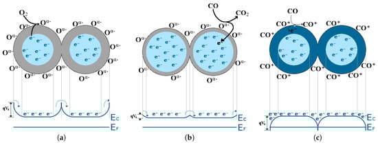 The ongoing miniaturization of electronics has shown to be essential for integration and advancing our technological capabilities. Transistor scaling has steadily followed Moore’s law up to the physical limitations; the gas sensor and environmental sensor fields have, nevertheless, lagged behind the progress achieved by CMOS devices, primarily due to their bulky nature and complex MEMS fabrication requirements. Discoveries in the application of semiconductor materials for gas sensing have given hope for the miniaturization, portability, and integration with the electronics of sensing systems. The first demonstration of the capability of a semiconductor to sense certain gas molecules, especially when heated, was performed by Brattain and Bardeen in the 1950s []. They noticed, for the first time, that the conductivity of several semiconductor films changed, when the chemical composition of the ambient was changed. The first gas sensing device based on this discovery was developed in the 1960s using zinc oxide (ZnO) as the sensing layer heated to 485 C []. To add to this dicsovery, by 1967 Shaver showed that doping the films slightly using noble metals, such as platinum, rhodium, iridium, gold, or paladium, can improve the sensor performance [].
