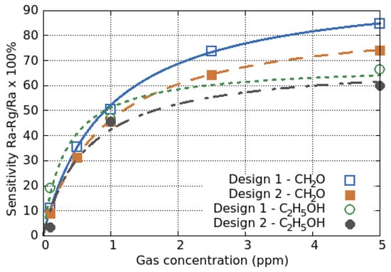 The results shown in Figure 3b are from measurements made on a Pt-doped SnO film with a thickness of 50 nm. The film was deposited using spray pyrolysis and the microheater temperature was set to 300 C during operation. []. An interesting pattern can be seen therein. When the platinum dopant was added to SnO at a concentration of 0.2 wt%, the sensor signal increased by about 10 times. However, when the platinum dopant concentration was increased by 10 times (from 0.2 wt% to 2.0 wt%), the sensor signal decreased. In fact, the signal decreased to levels below even the non-doped SnO film. The initial increase in the response in the presence of Pt particles takes place due to the dissociation of oxygen on platinum. The activated oxygen species are able to reach the SnO film, where they react with CO []. The reduced sensing response in the presence of 2 wt% Pt doped SnO can likely be attributed to a localized consumption of CO molecules without any donation or acceptance of electrons. This means that even in the presence of CO molecules, no changes in the SnO film’s resistivity can take place. Another reason may be because the added platinum particles shift the optimal operating temperature for the sensing film. While 300 C was appropriate for pure SnO films, the added platinum may have shifted the peak operating conditions to about 200 C or 250 C. More research into the influence of noble metal dopants and how they can be modeled is given in [,,]. In Figure 3, the symbols depict measured data, while the solid lines are best-fit power-law curves [,].